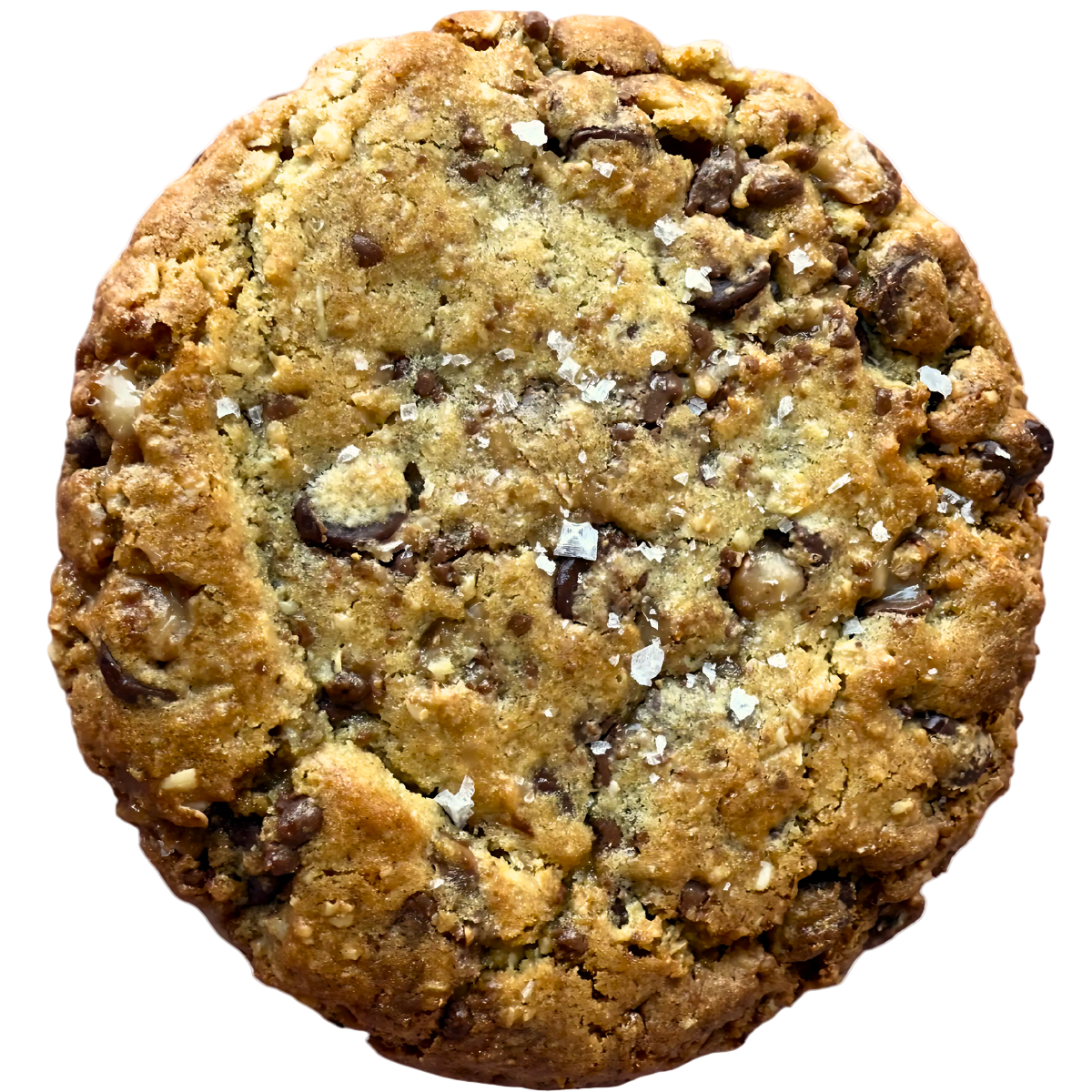 Our very first "Flattie" Big, bold, and battle-ready: our oat-and-toffee chocolate chip flat cookie with a sprinkle of sea salt. Crisp edges, gooey middle, and unapologetically oversized.